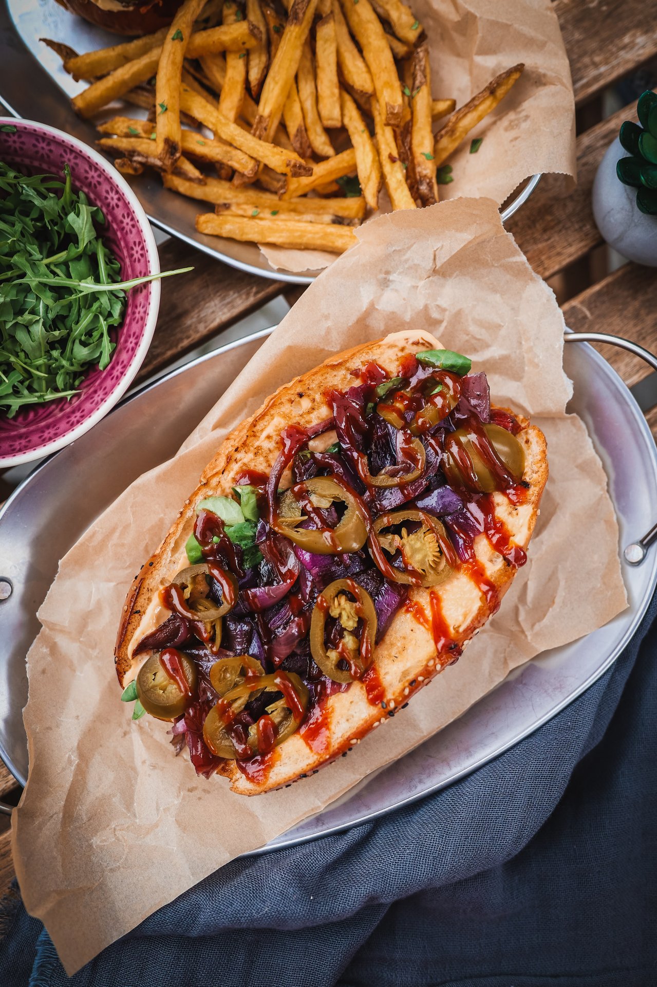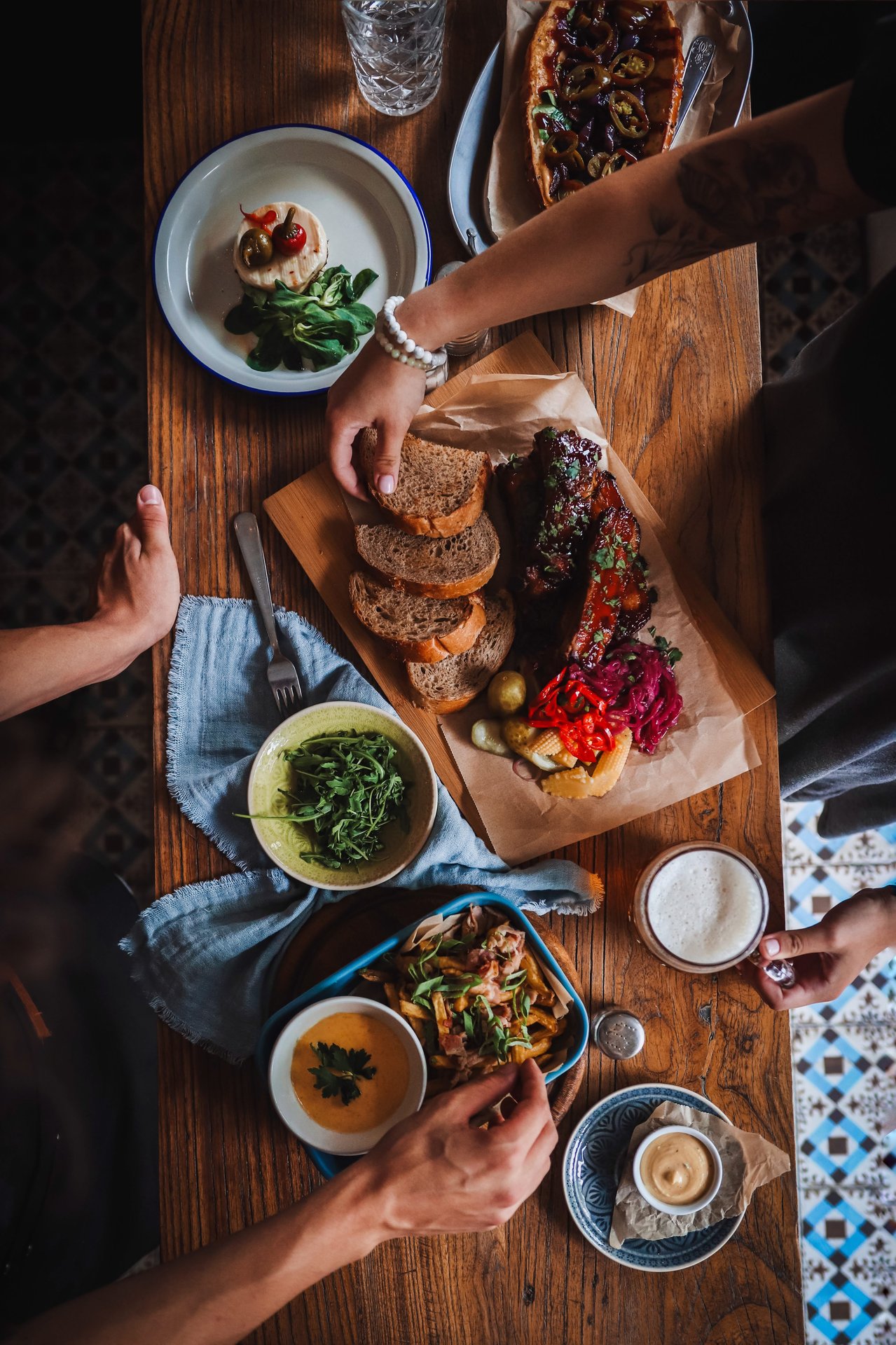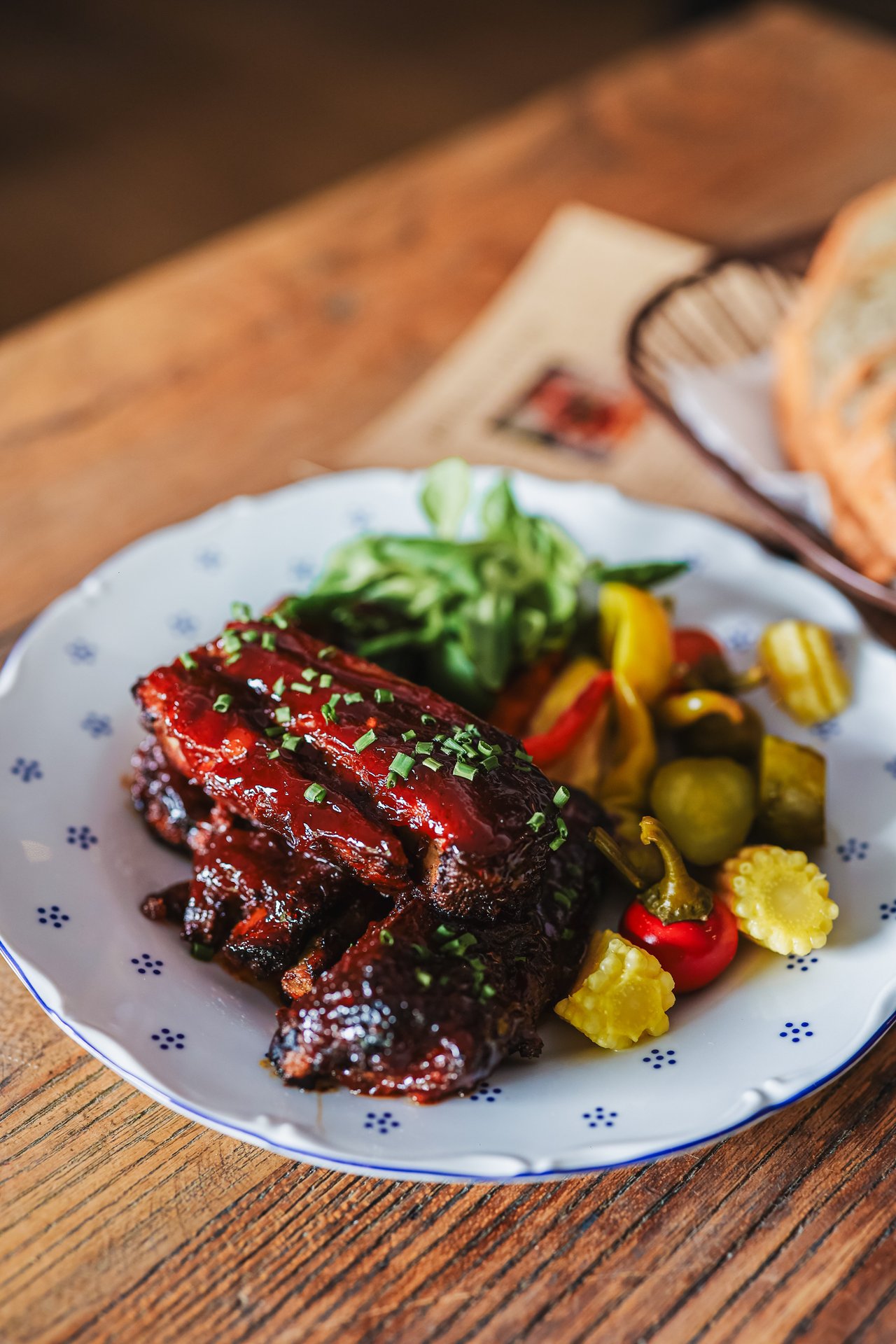mäsové rebierka podávané s bbq omáčkou, nakladanou zeleninou a kváskovým chlebom